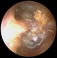 真珠腫性中耳炎とは、鼓膜や外耳道の皮膚が中耳に陥凹して耳垢と一緒に落ち込み、まわりの骨を破壊して拡大する病態です。耳内にたまった耳垢(角化物・デブリス)が、真っ白に変色して真珠の様に見えることから真珠腫と言われています。